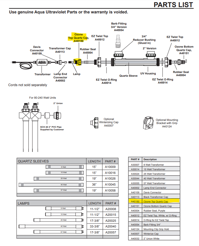 Aqua Ultraviolet Ozone Series Quartz UV Cap Ozone Top Part# A40150