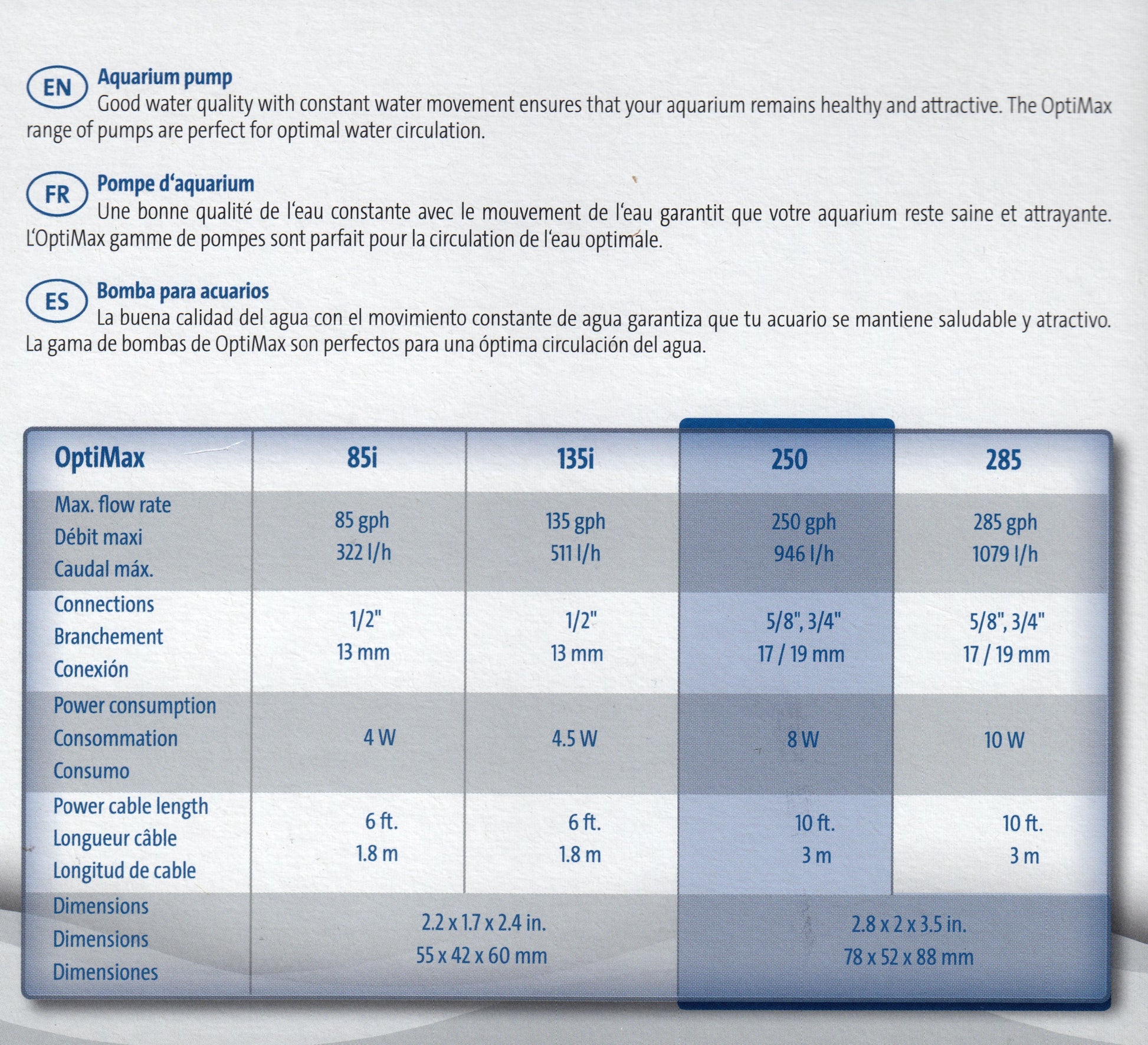 OptiMax 85i is a compact, lightweight and powerful adjustable flow aquarium pump. Pumping up to 250 gph powered with a 10' foot power cord. Designed of submersed operation for both fresh and marine water. Box includes suction cups of secure mounting and quite operation. Can be used as a wave maker pump as well. Energy efficient with a power consumption of 8 watts