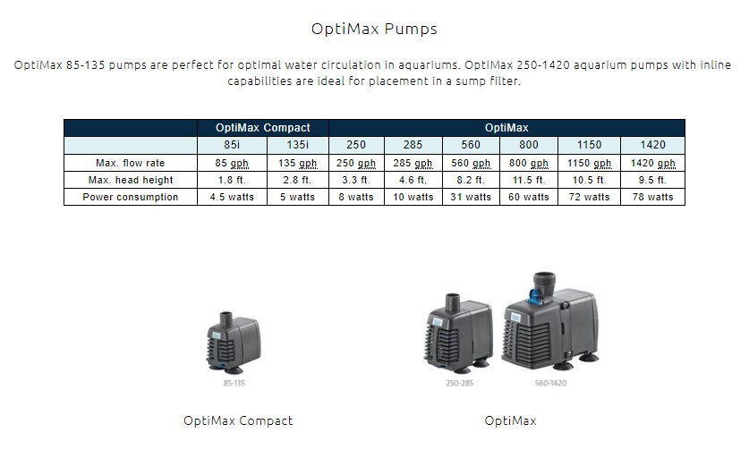 OptiMax 85i is a compact, lightweight and powerful adjustable flow aquarium pump. Pumping up to 85 gph powered with a 6' foot power cord. Designed for submersed only operation, for both fresh and marine water.. Box includes suction cups of secure mounting and quite operation. Can be used as a wave maker pump as well. Energy efficient with a power consumption of 4 watts