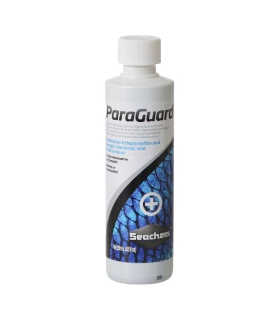 ParaGuard is the only fish and filter safe aldehyde based (10% by weight) parasite control product available (for parasites on fish). Unlike highly toxic and difficult to use formalin based medications, ParaGuard contains no formaldehyde or methanol and will not alter pH. ParaGuard™ employs a proprietary, synergistic blend of aldehydes, malachite green, and fish protective polymers that effectively and efficiently eradicates many ectoparasites (e.g. ich, etc.) and external fungal/bacterial/viral lesions (e.g., fin rot). It is particularly useful in hospital and receiving tanks for new fish and whenever new fish are introduced to a community tank.